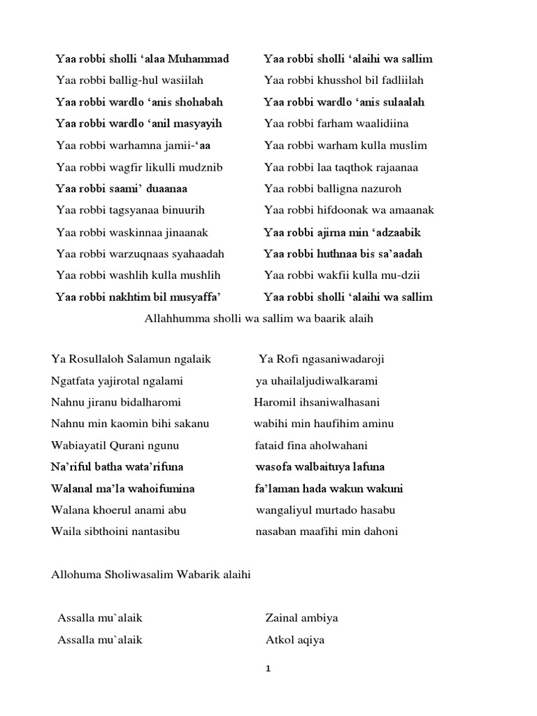 Qoshidah ya robbi sholli 'ala muhammad ini biasa dibacakan sebelum pembacaan maulid simthud duror. Ya alloh, tetapkanlah limpahan sholawat kepada nabi muhammad ya alloh, tetapkanlah limpahan sholawat dan salam kepadanya. Sholawat yaa robbi sholli ala muhammad versi lirik latin dan artinya. Pantura bersholawat dalam rangka memperingati hari lahir baginda nabi muhammad shallallahu alaihi wasallam. ﻳﺎ ﺭﺏ ﺻﻞ ﻋﻠﻴﻪ ﻭﺳﻠﻢ ya robbi shalli 'ala muhammad ya robbi shalli 'alayhi wasallim ya allah, tetapkanlah limpahan rahmat kepada nabi muhammad ya allah bacaan shalawat kubro ( latin dan terjemah ) بسم الله الرحمن الرحيم bismillâhir rohmânir rohîm dengan nama allah yang maha pengasih.